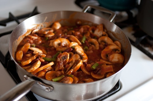 This is one of the recipes from our newlywed days. It was perfect then, and is still perfect now. I’ve adapted the recipe over the years as our eating habits change, and its flexibility is exactly what makes it perfect for End-of-the-Month cooking. Got half a pound of stew meat in the freezer? Brown it and throw it in. Bell pepper rolling around in the produce drawer? Add it in. You should feel free to substitute other beans for the ones listed here, or leave out some beans and replace them with meat, or add in some extra veggies. I usually use dried beans instead of canned, just because it’s more economical. And I frequently add in carrots, celery, zucchini or beef.