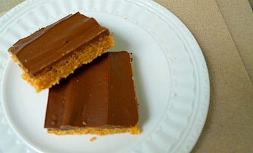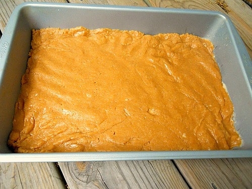 Simply make your favorite peanut butter cookie recipe and press the dough into a greased 9×13″ baking pan.