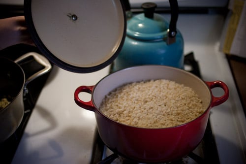 I know that we are all impatient Americans and we just can’t stand to let something simmer without taking a peek. However, the best tip I ever got on rice cooking was “Do not disturb the pot!”. Don’t stir it. Don’t take off the lid. Don’t even sniff it. I know it’s hard. You’re worried that it’s scorching the bottom of your enameled pot. If you follow the directions here, no harm will come to your pot. Promise.