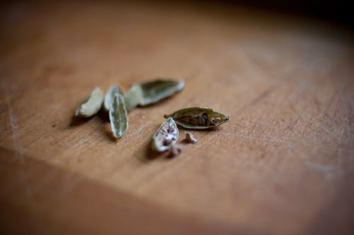 1. In a heavy, flameproof casserole, melt butter and olive oil. Open cardamom pods and add seeds to the casserole.
