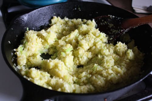 We had a leek in the fridge from a friend’s farm, so we used that instead of the onion. I used my food processor to make quick work of chopping the zucchini flesh. Do be sure to squeeze, and squeeze, and squeeze to remove as much water as possible. I like to put mine in a fine-meshed colander and press down on it over and over again. All the water goes straight out the bottom.
