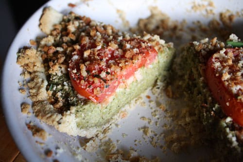 - Spoon the filling into the crust and smooth out evenly. Sprinkle the top with half the bread crumbs and drizzle with 1 tbsp olive oil. Then place the tomato slices on top of the bread crumbs. Sprinkle on the remaining bread crumbs, some pepper, a little salt, and the chopped herbs. Drizzle with a bit more oil. Bake for 45 minutes and let cool for 20 minutes before serving.