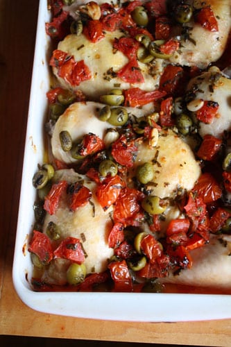 How many recipes have I posted with these ingredients?? It seems like I might have a dozen or so variations of this recipe. What can I say? I like tomatoes and olives (and chicken, too, I guess).