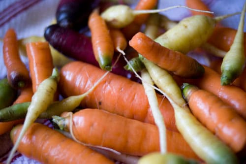 Carrots I handle the same way as my beans. Chop or shred into whatever size you want. Drop them briefly into a steamer (again, three minutes should do it). Rinse with cold water. Spread onto a towel to let them cool and dry. Bag them up and freeze.