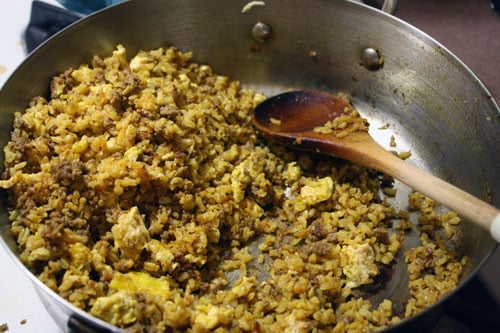 The ingredients I’ve listed here reflect how I made this dish. The original recipe calls for four cups of rice, but I couldn’t tell if it meant four cups cooked or four cups uncooked rice. So I cooked up four cups of uncooked rice, and ended up using about half of it in the recipe. So, to save you the trouble, use about four cups cooked or two cups uncooked rice.