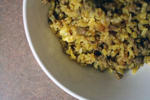 I love the flexibility of this dish. Use any meat that you have on hand–ground beef, shredded chicken, salad shrimp–or leave out the meat and make it vegetarian. I’ll definitely be adding some veggies in next time. I think some peas or diced carrots or bell peppers would be really yummy here.