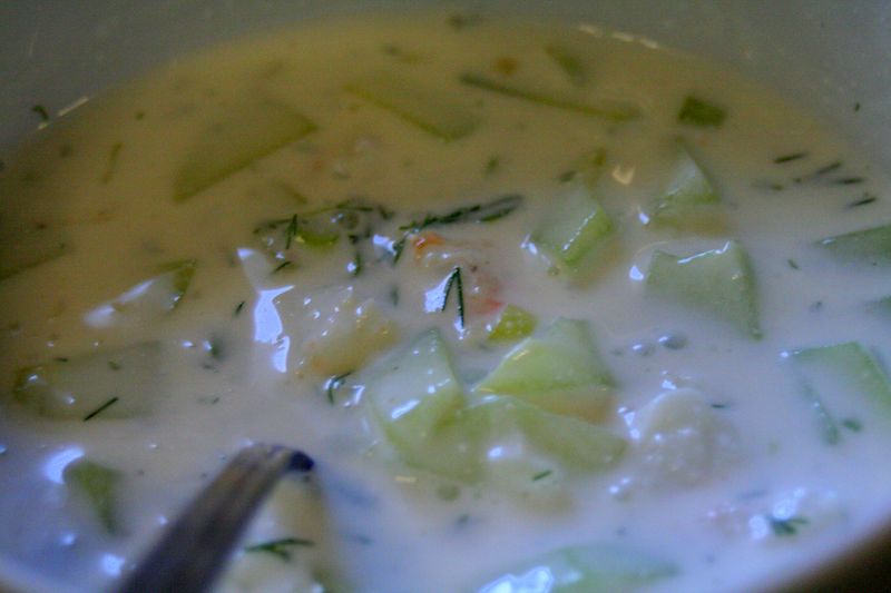 Have you tried your hand at culturing dairy yet? It’s really not as scary as it sounds. Making my own buttermilk was seriously the easiest thing. And it was so satisfying to do it myself and feel all self-sufficient and handy. First I got some starter (you can get it from New England Cheesemaking Supply Co.) and since then have just been using a quarter cup or so of one batch to start the next. The milk only needs to be in the low seventies to culture. It’s really simple to just let it sit to warm up to room temperature if you keep the house warm, or warm it over the stove on low, then mix in some already-cultured buttermilk and let it sit overnight. The next morning you have delicious fresh buttermilk! The culture I have must be really strong because the buttermilk comes out quite thick; I love it. I’ve been using it in pancakes, to soak grains, in macaroni and cheese, and in this delicious Russian soup. The soup recipe was from Nourishing Traditions. And it was AMAZING! We all loved it (even the little ones!) and it was chock full of good healthy enzymes. It was a base of buttermilk, creme fraiche (both made at home from raw milk), some sauerkraut juice (Bubbies brand, so also with live cultures), fresh cucumbers, cooked shrimp and fresh dill. I served it cold and it was SO delicious! It would be a perfect fresh summer treat. I’ll definitely be coming back to this recipe in the summer when we have cucumbers coming out our ears and the dill is growing waist high in the garden!