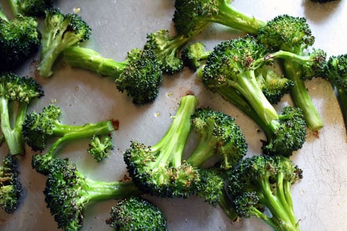 I do recommend only using the best parts of the broccoli–the florets and the tender stems just below them. The thick stems are good for cream of broccoli soup or broccoli and cheese casserole, but not for hard-core roasted broccoli. If you just can’t stand to throw them away, put them back in the fridge and make one of the above dishes later in the week.