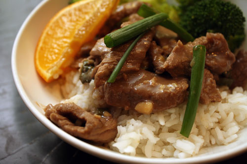 We eat out very rarely. But if it’s a special occasion, or if someone’s parents are in town and treating us all to dinner, the Sweetie Pie really likes to go to a local Chinese place. He always spends lots of time reading the menu, wavering between this dish or that one, and then–every single time–he ends up ordering the orange beef. He saw this recipe when the magazine came in the mail and he said, “Ooh, yum!” What else could I do? The dish had to be made.