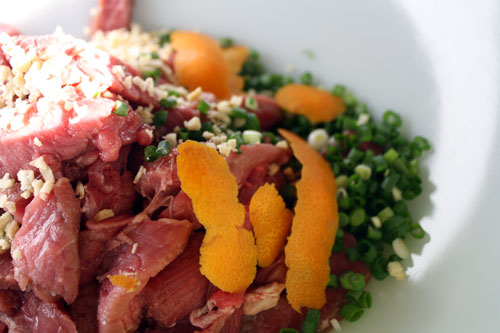 - In a bowl, combine the beef, thinly sliced scallion, ginger, zest, potato starch, and salt; toss to coat. In a separate bowl, combine juice, soy-less sauce, vinegar, honey, and 2 Tbs water.