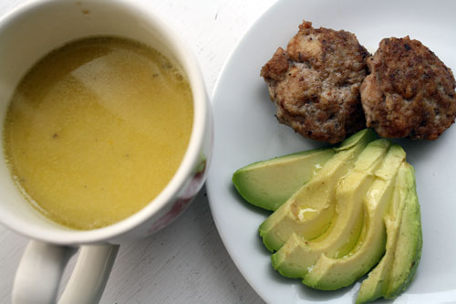 - Around 9:30 I start getting hungry. For the past couple of weeks I’ve been having homemade chicken sausage, sliced avocado, and a mug of chicken broth for breakfast. If I could have egg whites, I’d add a scrambled egg to this. Or if I could have dairy, I’d add some yogurt.