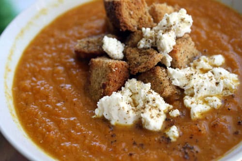 Last summer, we had a bountiful crop of carrots in the garden and I struggled to find recipes in which to use them all. I wish I’d had this recipe then. Not only was it delicious and used up a rather large bunch of carrots from the CSA box, everyone at the table gobbled it up and asked for seconds. If I’d been thinking while I was cooking, I could have even made the soup be GAPS-friendly (minus the croutons and cheese). Alas, that didn’t occur to me until after the soup was made.