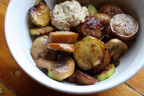 - Dinner: Sauteed sausages with zucchini and mushrooms, or turkey burgers with mustard, lettuce, and sauerkraut