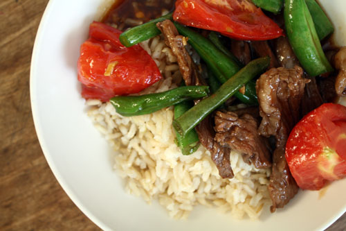 - In a large saute pan, heat oil and quickly sear flank steak over high heat. Remove from pan into a large bowl. Add beans to pan and cook until tender, about 1 minute; add to bowl with beef. Toss with sauce and tomatoes and serve over brown rice.