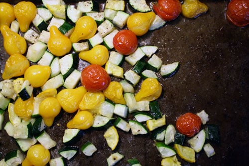 I simplified my roasting technique from what is written in the recipe. I scattered the squash and roasted it for 5 minutes, and then added the tomatoes and roasted it for 10 minutes more. I can’t say if the flavor was any different, but it sure was quicker and I had fewer dishes to wash. I also chose to roast my veggies in coconut oil, though I think butter or ghee would be divine.