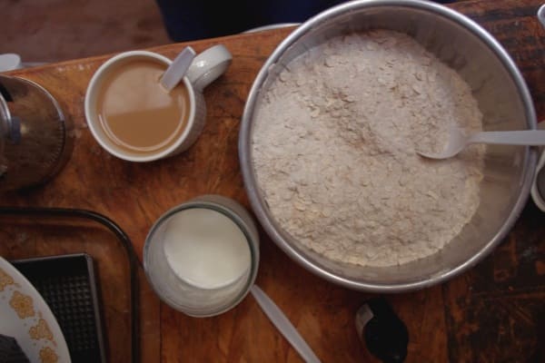 - In a medium bowl combine rye flour, oats, baking powder, salt, and cinnamon.