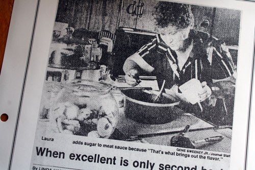 This was Grandma Laura’s recipe, as printed in the newspaper that featured her cooking. Don’t try to update it by using fresh mushrooms or fancy olives. The canned ingredients make it the real deal. <br> <br>Grandma says that adding sugar to meat sauce “brings out the flavor”.