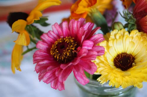 To round out the meal, I threw together a quick salad. And for an extra special touch, I allowed the Sweet Pea to roam through the garden with her flower snips. She brought in a lovely bouquet for the centerpiece.