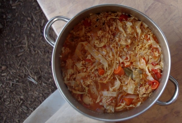 - Melt butter in a dutch oven over medium heat. Add chicken pieces and brown on one side. Flip and add onions, carrots, and cabbage. Saute a few minutes before adding rice. Saute a few more minutes.