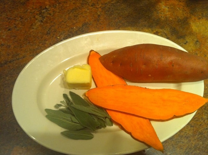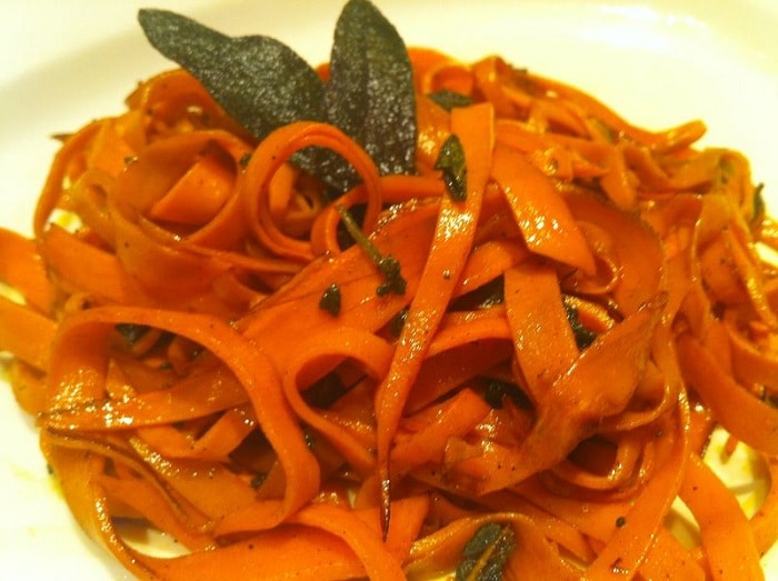 - In a saucepan melt the butter then add the sage. Watch the pan closely as butter begins to brown. When sage gets crispy, remove and set aside. Add sweet potato linguine to butter and heat through while stirring and tossing. Take sage (saving a couple for garnish) and crumble into pasta. Salt and pepper to taste. Plate and garnish with fried sage. Enjoy!