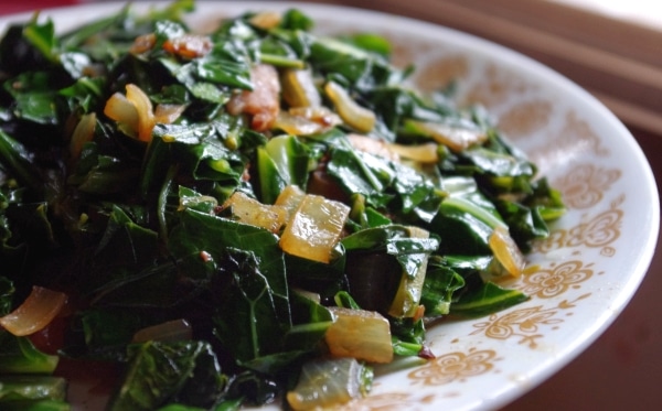 So naturally, I have been incorporating these two staple foods into as many meals as possible, including a simple vegetable-based lunch that combines the two. Along with some bacon or salt pork, most likely a staple meat in our near future, the greens come alive with some onions and garlic.