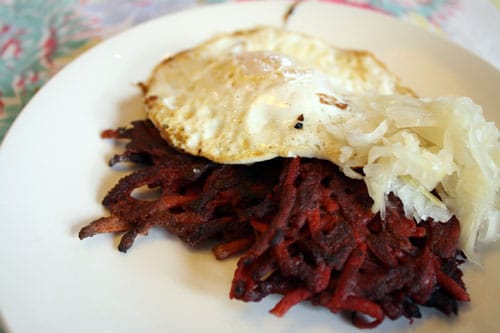 * photos of a day of food in my current quasi-GAPS diet (this was a particularly disciplined day–sauerkraut with every meal, soup for one meal, no rice, and no legumes): Sweet Potato and Beet Latkes with a fried egg and sauerkraut; Turkey Sloppy Joe over chopped iceberg lettuce with sauerkraut; Slow Cooked Apples; Chicken and Butternut Squash Soup; Banana Mush