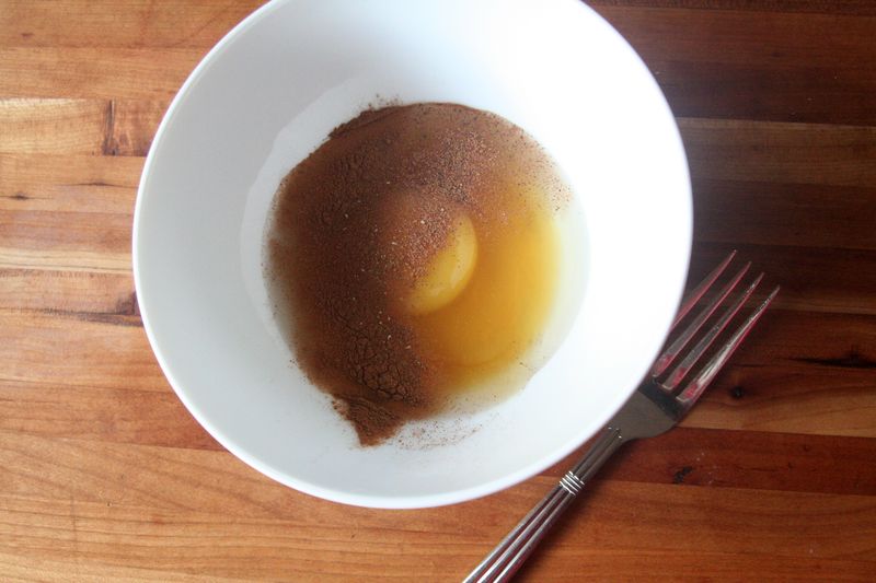- Beat one egg with some maple syrup, cinnamon and nutmeg. Beat it really well so you don’t end up with chunks of egg.
