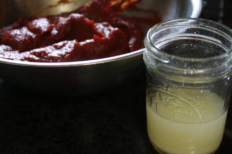 For the whey, I just put some yogurt in a cheesecloth and let a bit drain out. I didn’t have homemade tomato paste, but I did have a few jars of organic stuff kicking around in the pantry. I think the store-bought stuff lent it a bit more of an acidic taste. If I follow through with my goal of canning bushels of tomatoes this summer I’ll try it again with the homemade version.