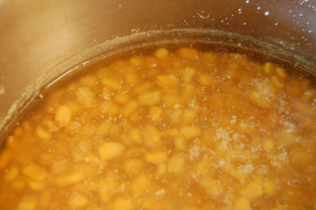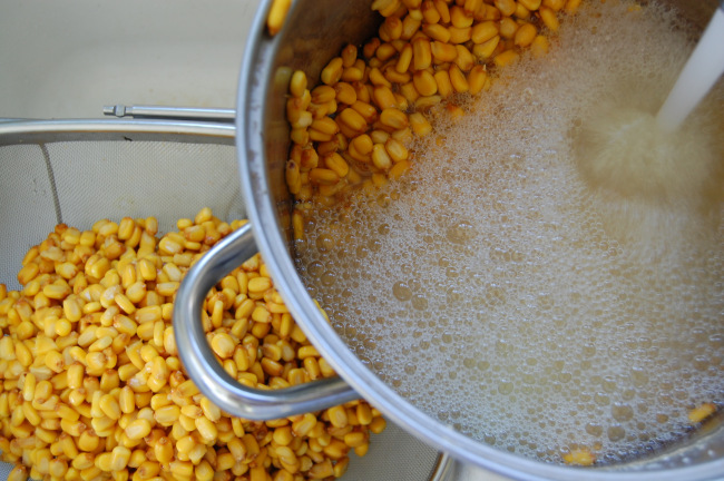 Cover corn mixture with filtered water in a stockpot (make sure it is covered by a few inches, as the corn will expand). Bring mixture to a boil, then simmer for 10 minutes. Remove from heat and cover. Let soak/ferment in that cooked limewater for at least 24 hours – or up to two weeks. I let mine soak for 3 days.
