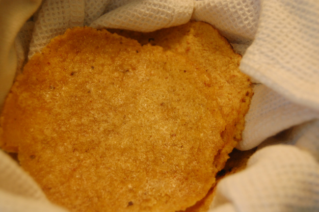 I thought the result was great, not quite as soft and flexible as the Bob’s Red Mill flour recipe, though. A friend tasted them and said how much she loved the texture of them – “You can really taste the corn!”. I agree – a rustic texture with tiny flecks from the corn’s germ really added interest.