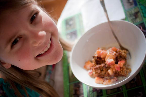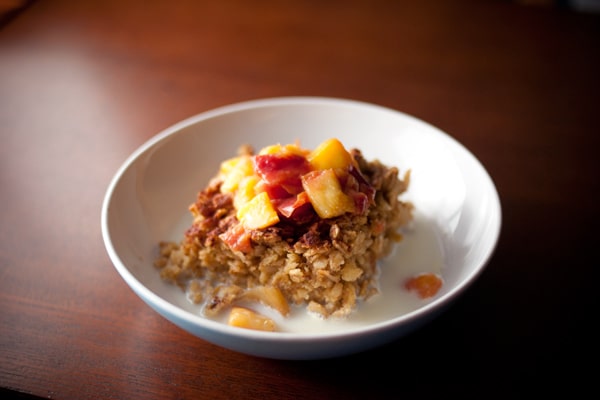 For our version we baked apples, cinnamon, and rapadura (drizzled honey works just as well) into the bottom to create an autumn flavor. The meat of the dish is the 2 inches of baked oatmeal in the middle. The topping was a combination of fresh mangos and nectarines simmered on the stovetop to remind ourselves that spring will come… eventually.