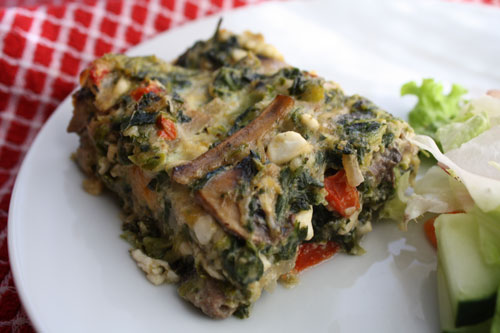 I don’t generally think of casseroles as being summer meals, but I think this one works. I assembled and baked it in the morning, then served it at room temperature with a salad for dinner. We’re sure to revisit this recipe again and again this summer, using up whatever our garden is giving us. I’m sure it will be equally tasty with zucchini, or peppers, or chard, or tomatoes. Thanks, Terry, for the great recipe! It’s moving from my stash into my Plan to Eat account.