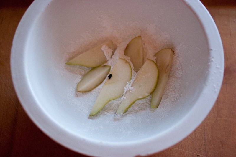 which is a baked flan with cherries. The difference between the Clafoutis and the Flaugnarde is that Clafoutis is distinctly made with cherries while a Flaugnarde is made with pretty much anything else. Our Flaugnarde was made with pears, but could have been made with any fruit that can be topped with a batter; strawberries, apples, blueberries, etc.