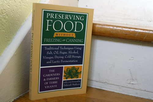 Preserving Food focuses on eight basic methods of traditional food preservation, all heavily used before the industrial revolution gave us canning and freezing methods: root cellaring; dehydrating; lactic fermentation; and preserving in oil, vinegar, salt, sugar, and alcohol. Each of these methods, as noted in the foreword by Eliot Coleman, enhance the life found in the food, making it more nutrient dense, or more digestible, or more flavorful. These methods add something to food being preserved, which can give us (in the words of Deborah Madison) “food that sings, not the blues of freezer burn and heavy syrup, but the joyful chorus of elemental flavors wrought by sun and air, salt and vinegar, fat and fermentation.”