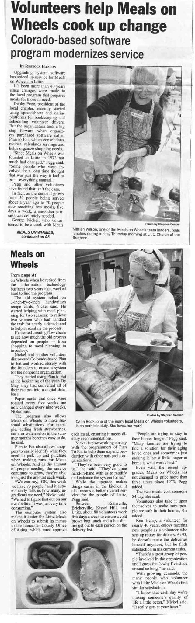 Plan to Eat was approached by the Lititz Pennsylvania Meals on Wheels to see if we could help them organize their recipes, coordinate their menu plan, and make shopping lists. Yes we can help with that — that’s what we do!