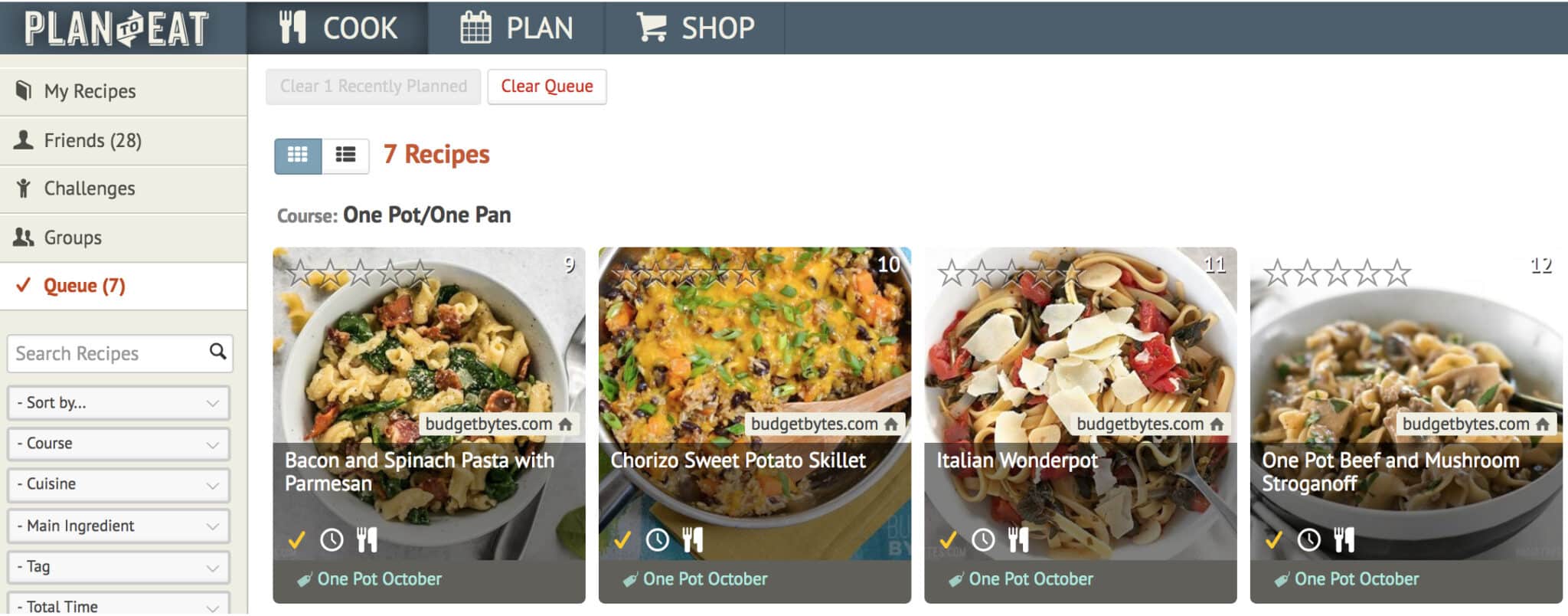 When you find recipes in your recipe book, you can easily add them to your Queue. This is a holding section for recipes that you want to plan this week or in the weeks to come. On each recipe, you’ll see a “checkmark” icon. Press this and your recipe is added to the queue. We love this feature, because it allows you to cull down your recipes to just a few you would like to plan soon. Less overwhelm in planning is always a good thing!