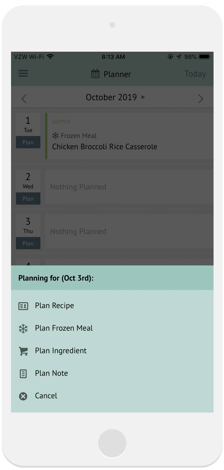 2. In the menu that opens, tap Plan Frozen Meal*