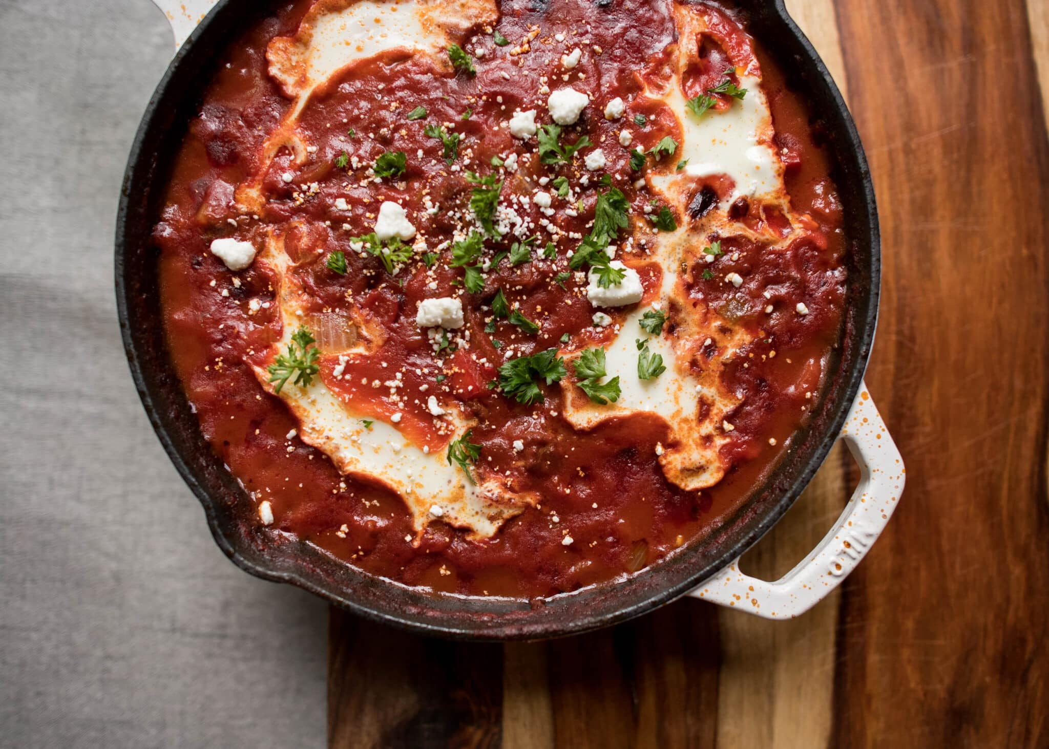We made shakshuka in the 10” skillet, which turned out to be the perfect size for this 4 serving recipe. We started the dish on the stovetop, sauteing the chorizo and veggies and then popped it right in the oven to finish the eggs!
