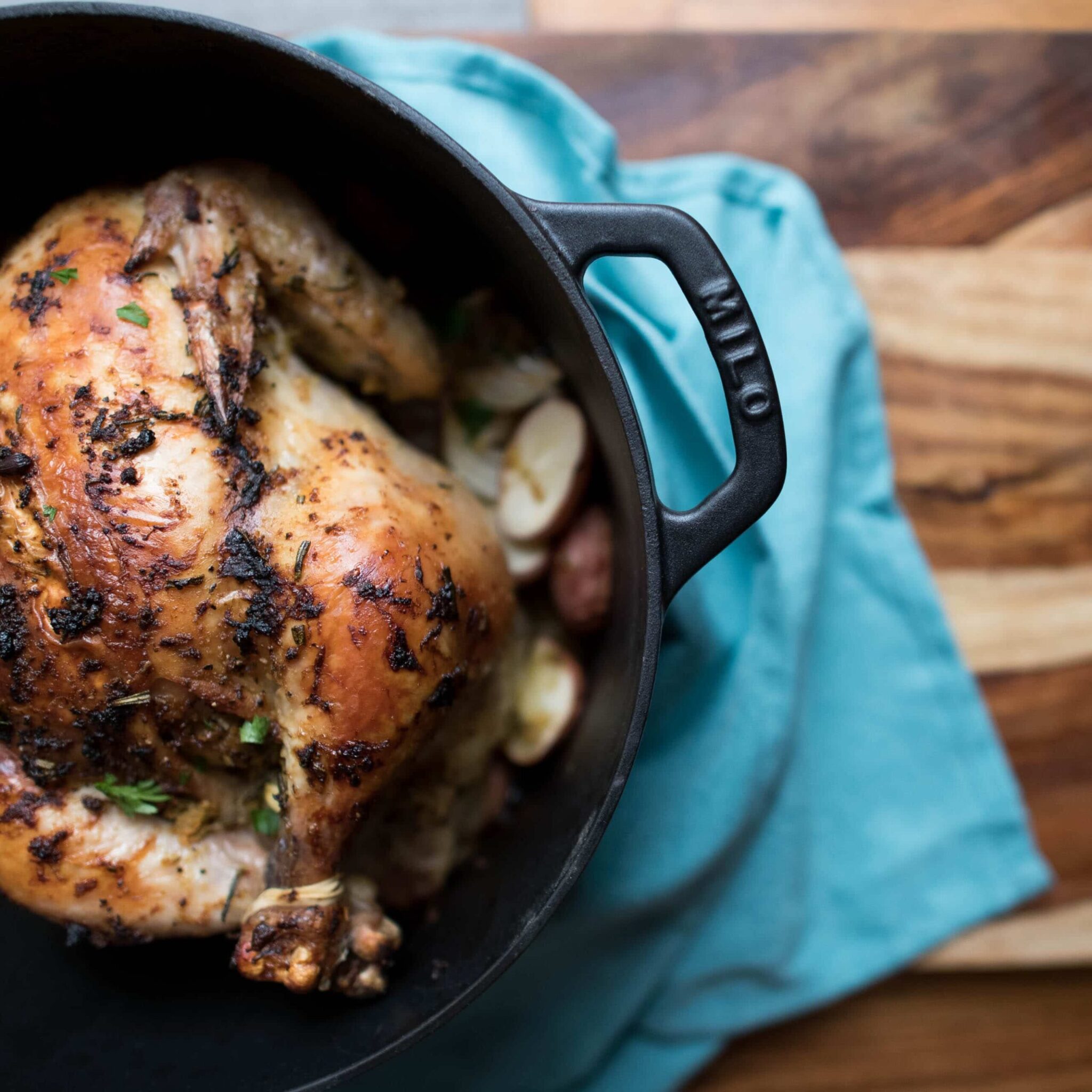 In the large dutch oven, we baked a whole chicken. Seriously! We fit a 5lb chicken in this dutch oven, which made for a hefty pot to take out of the oven, but it was the perfect size! The chicken came out ridiculously tender and moist with the potatoes and onions cooked through perfectly.