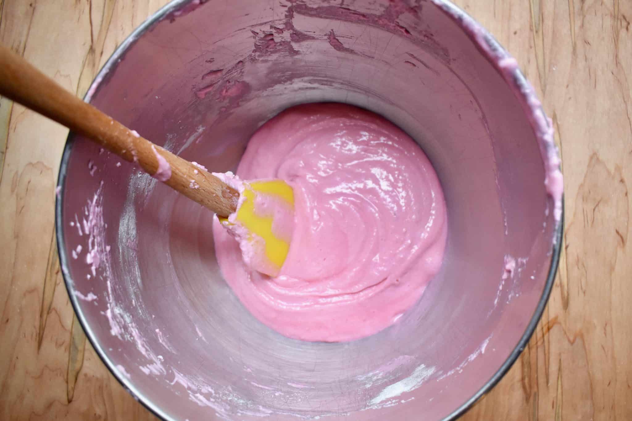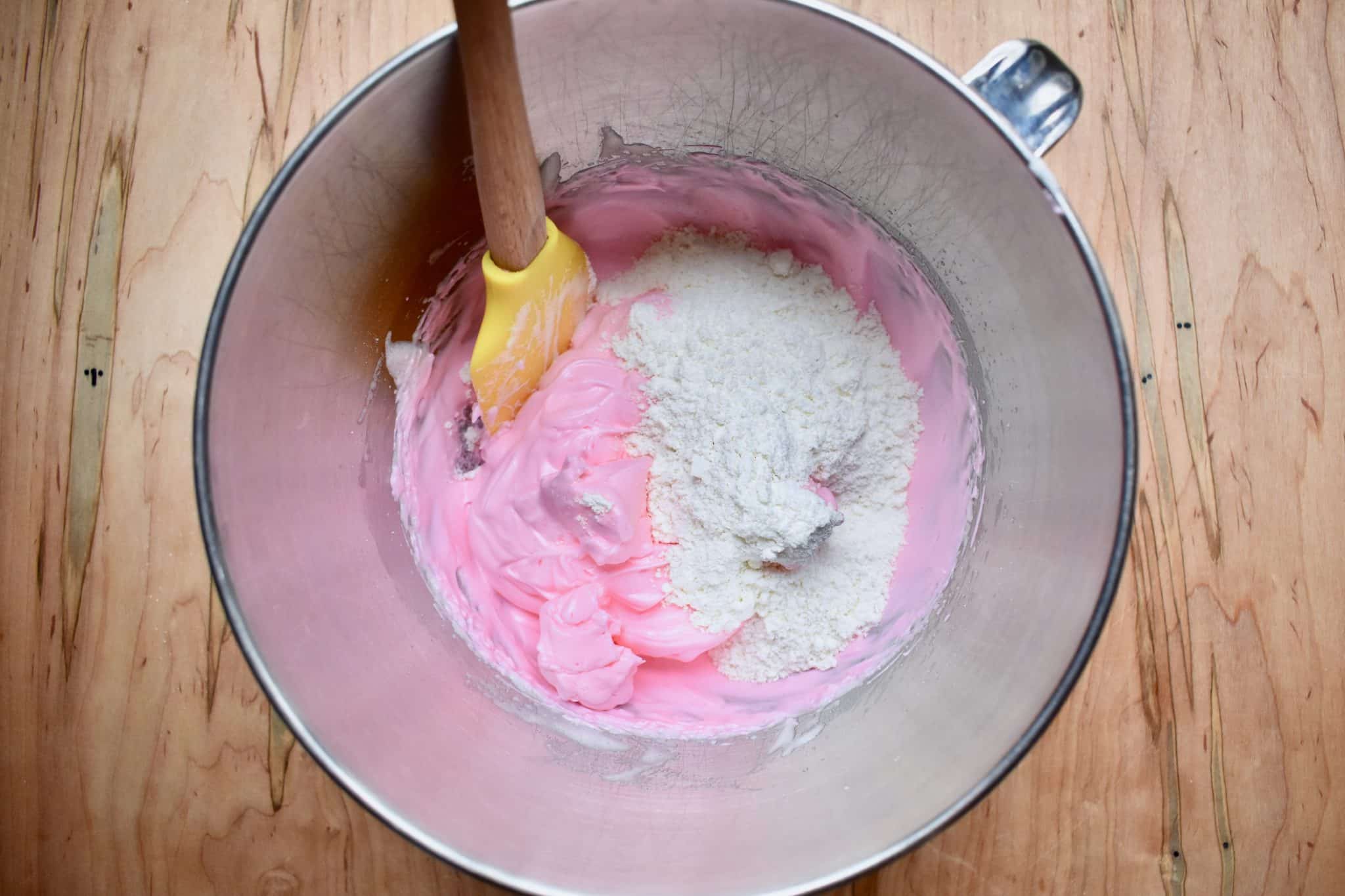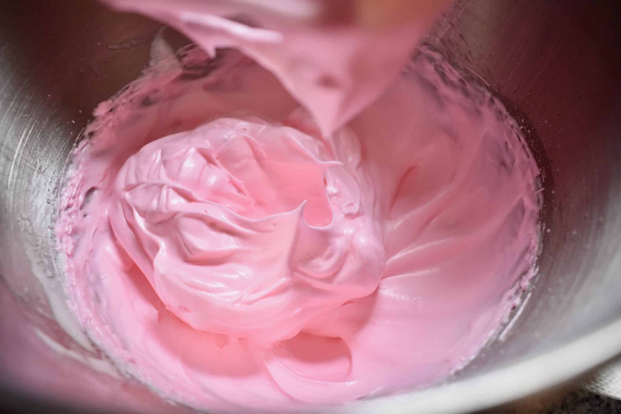 - In a separate bowl, whip the egg whites until they are no longer clear and start to increase in volume. Gradually mix in the sugar. Once sugar is incorporated, and before you reach stiff peaks, add in the food coloring. Continue beating the egg whites until they form stiff peaks.
