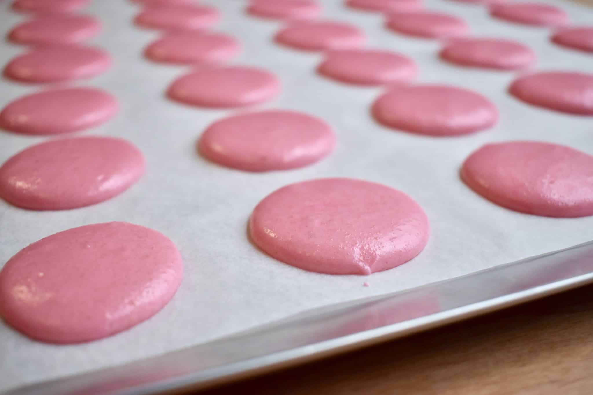 - Pipe the batter into 1.5 inch circles. Drop the baking sheet on the counter several times to remove as many air bubbles as possible.