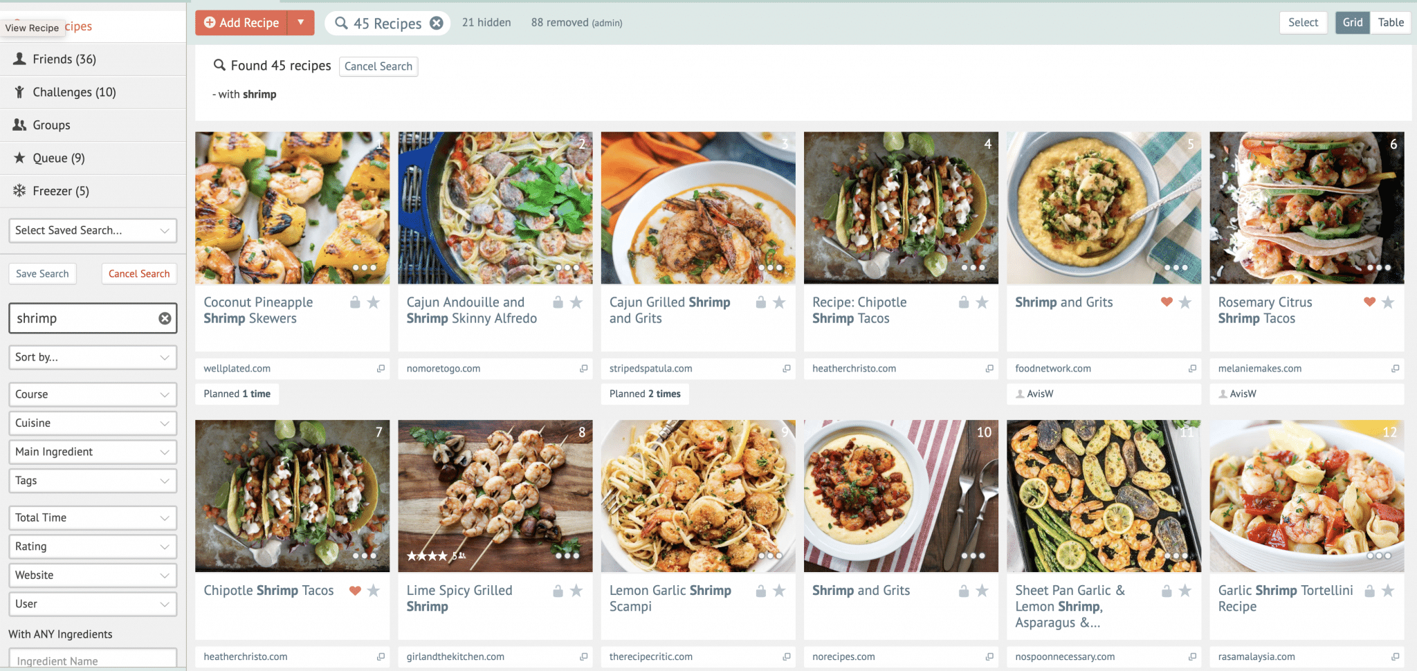 - I have frozen shrimp, so I filter my Plan to Eat recipe book for Shrimp to see what recipes use that protein. I choose one for Pineapple Shrimp Skewers (that sounds great!) and I add it to my planner.