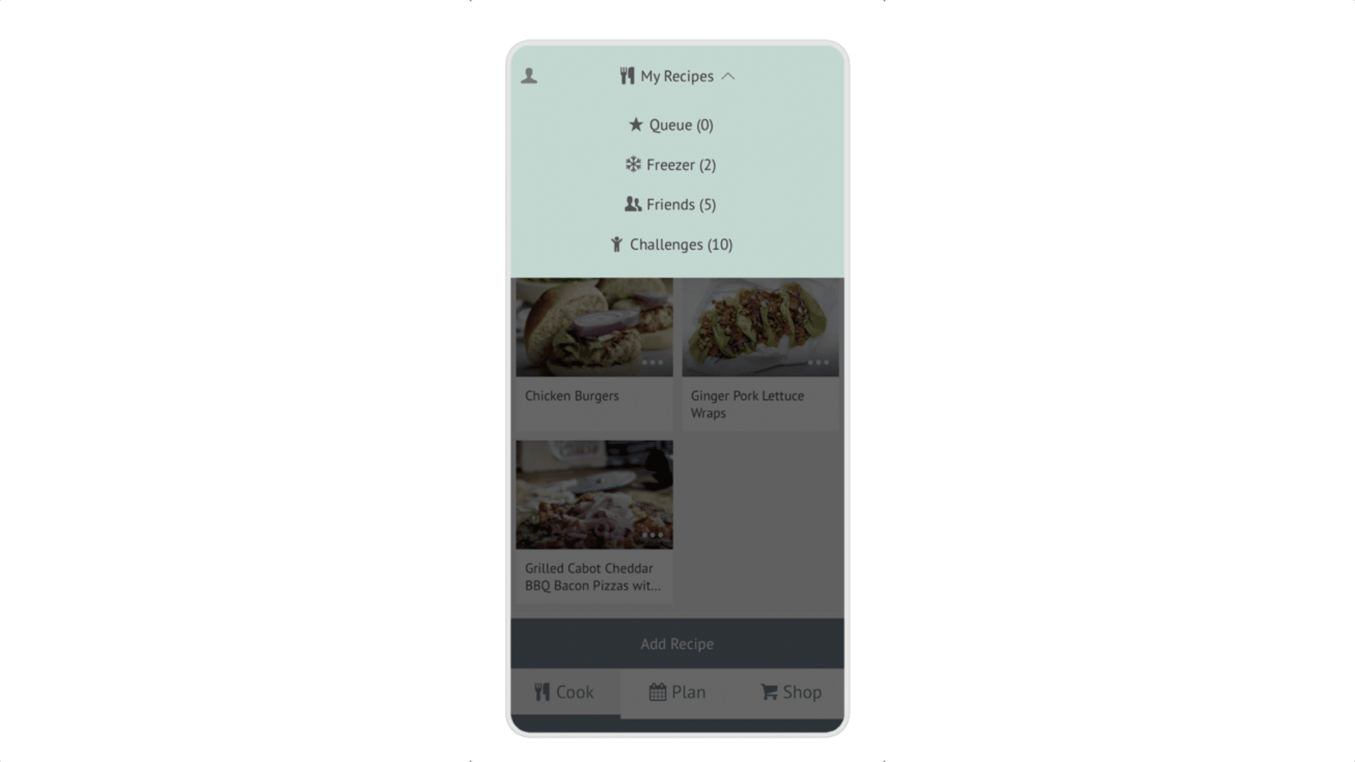 From your Recipe Book, tap on the My Recipes header and select Freezer to plan and manage your frozen recipes.