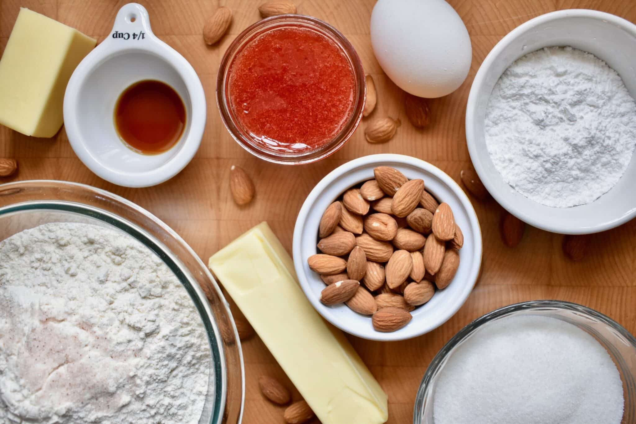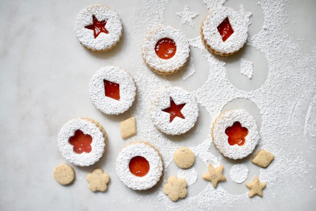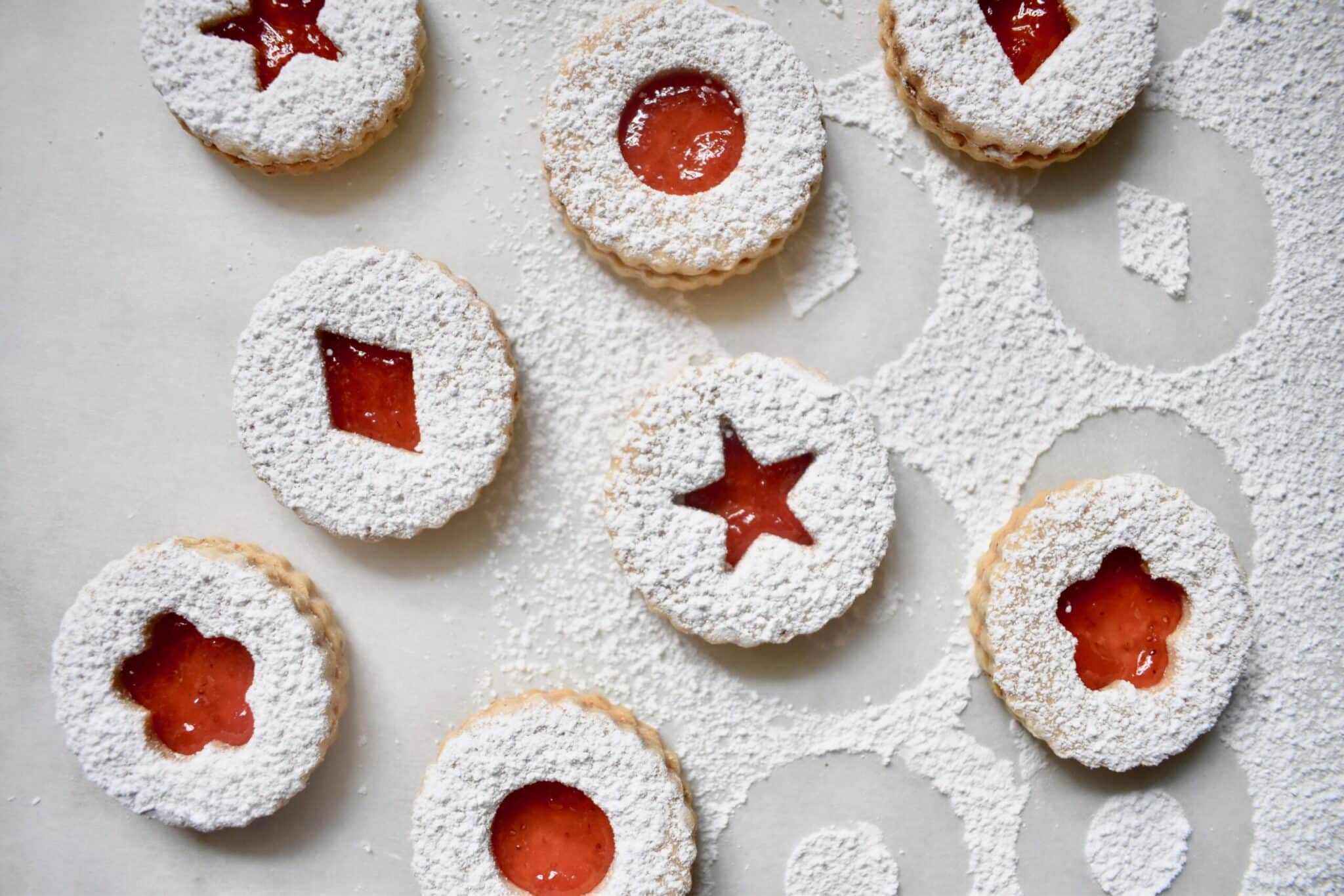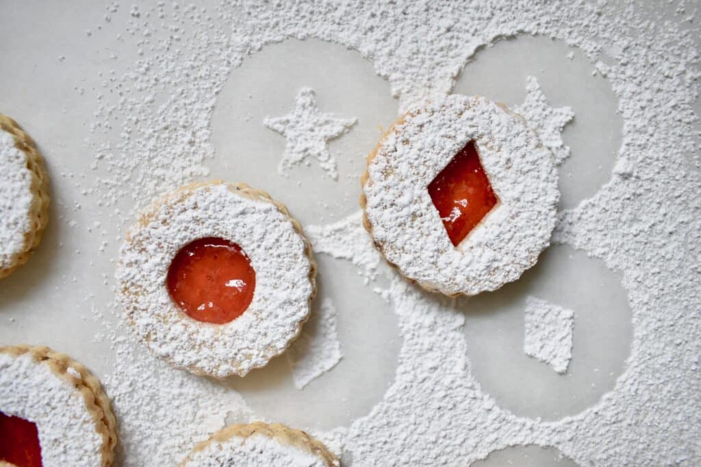 These cookies are so special. The crisp almond shortbread paired with the tart yet sweet jelly and powdered sugar make the perfect not-too-sweet and truly delicious cookie. They are as beautiful as gingerbread or sugar cookies decorated with royal icing, but a little less time intensive and a little more complex flavor combination… win win! Once you try them you will be sharing them with everyone this Christmas!