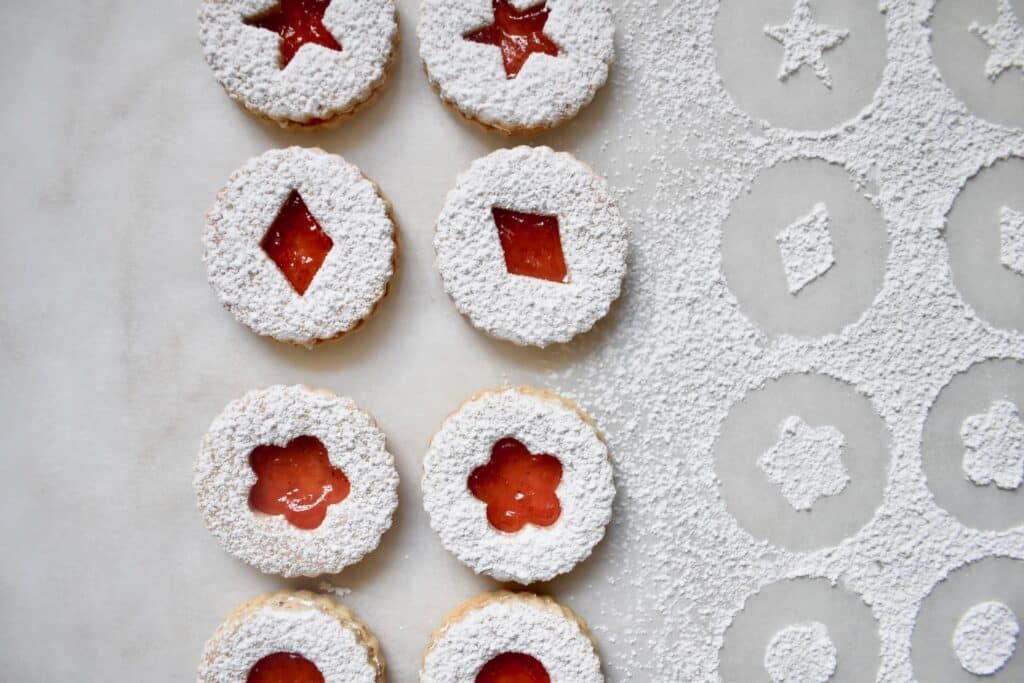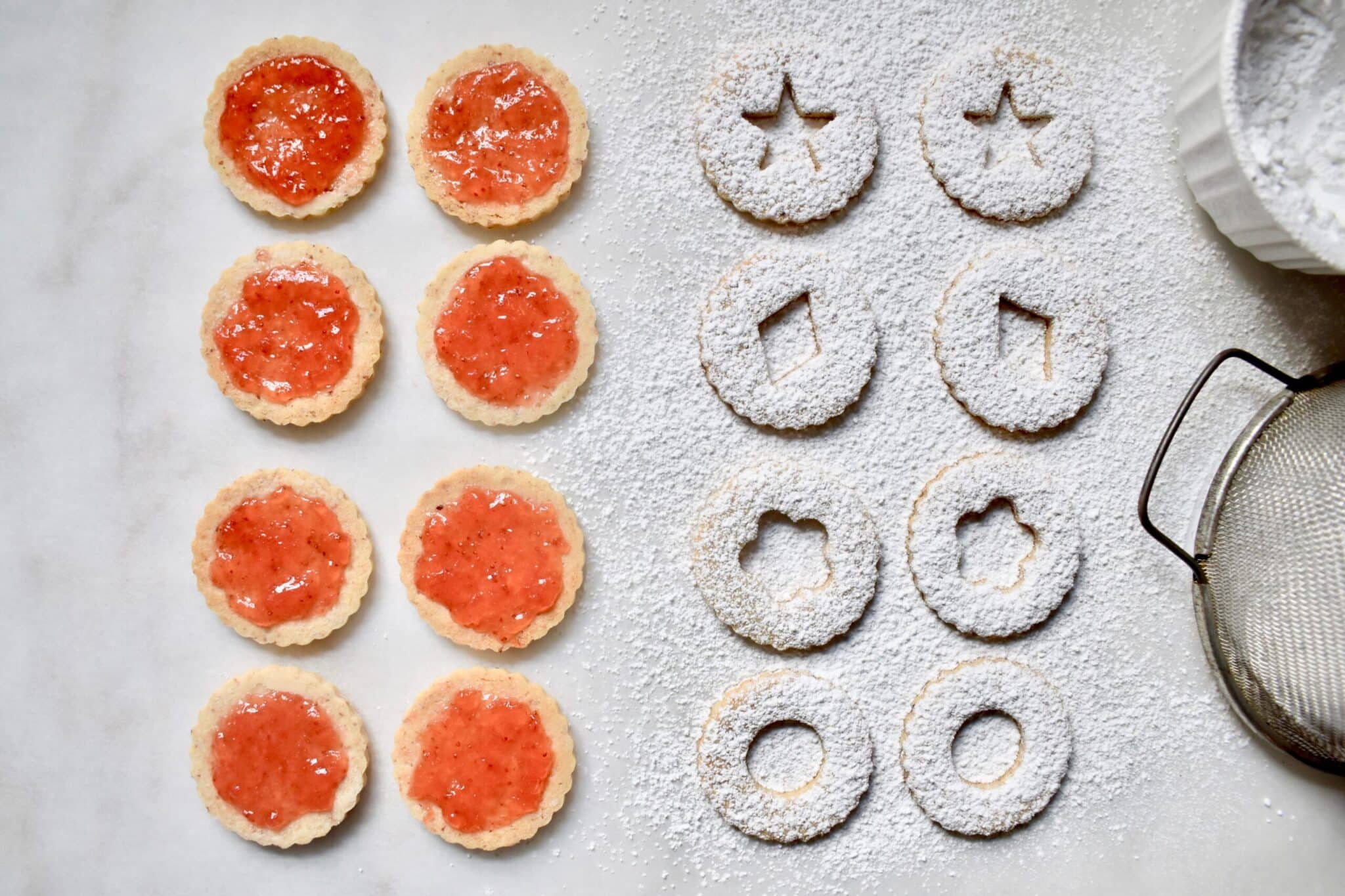 - To assemble, evenly spread the solid bottom halves with slightly less than 1 teaspoon of jelly, leaving a 1/4 inch space around the edge. Working on top of parchment paper, use a fine mesh sieve to dust the tops of the cut-out cookies with powdered sugar. Place a cut-out cookie on top of each jelly covered cookie and press down gently to seal.