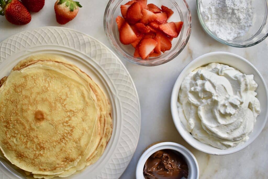 While the batter is resting, you can prep the filling ingredients. For these crepes I chose to use Nutella, fresh whipped cream, and strawberries. A light dusting of powdered sugar on top makes it that much fancier! Other options for breakfast or dessert fillings are blueberries, raspberries, pineapple, banana, peaches, lemon curd, maple syrup, honey, chocolate, peanut butter, cream cheese, cinnamon… the list goes on!