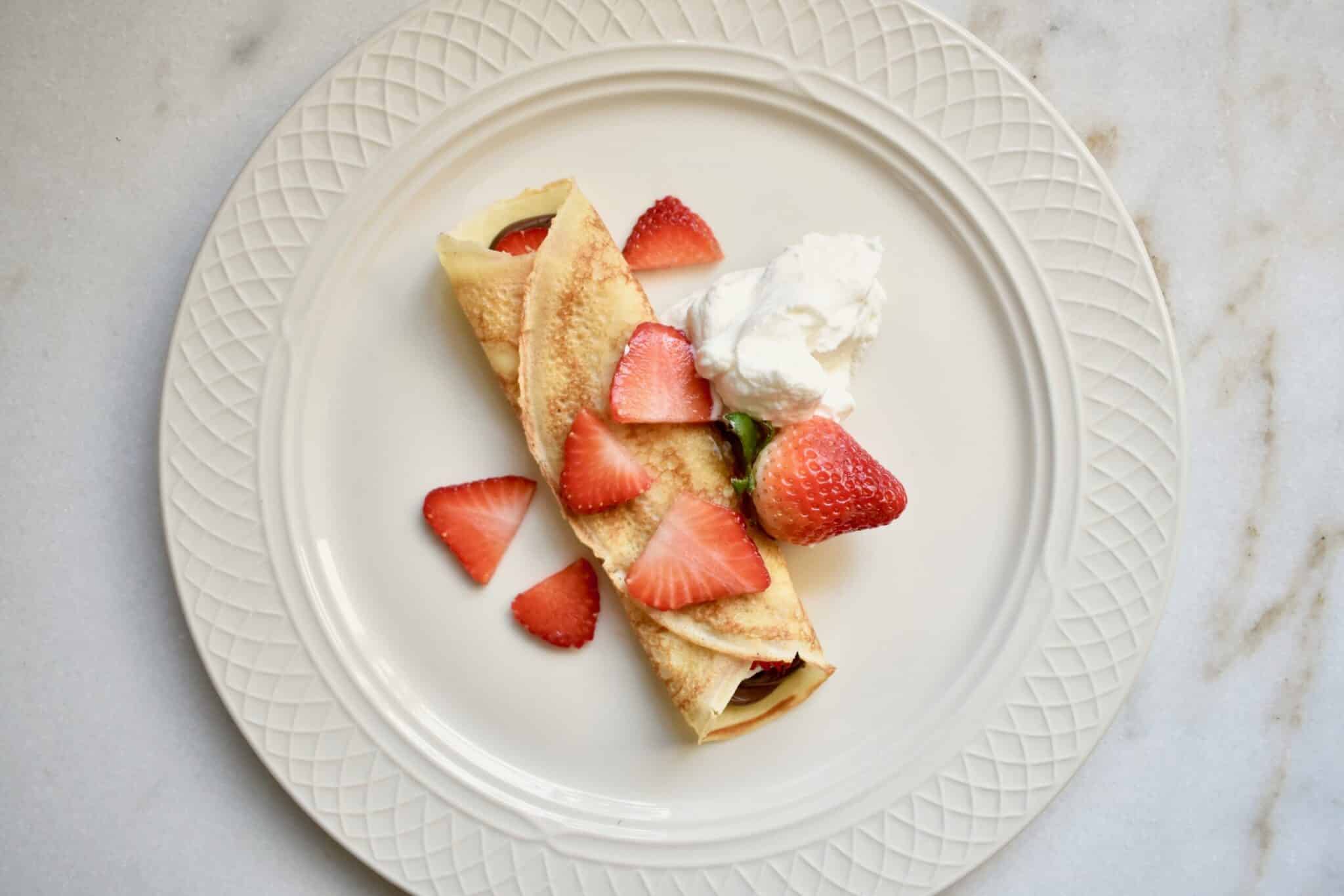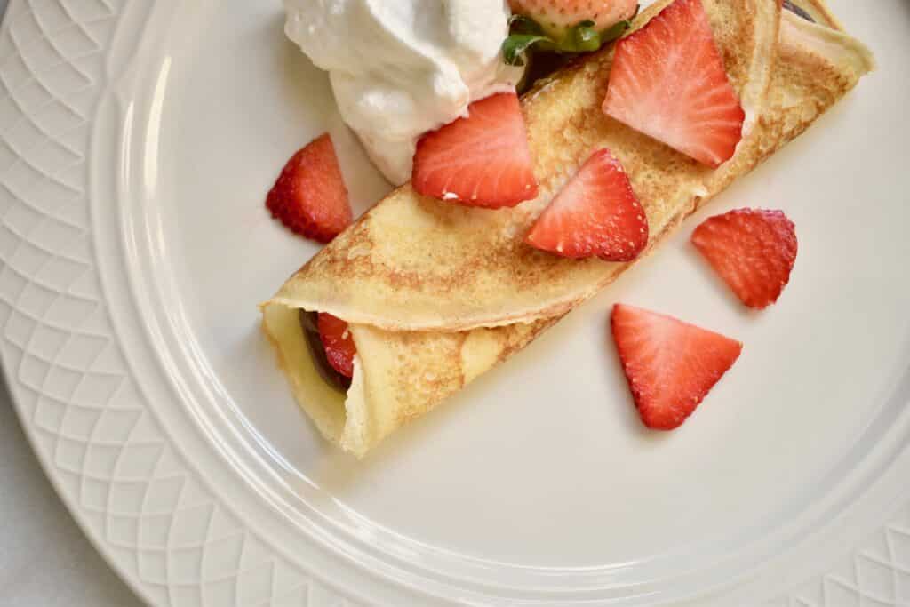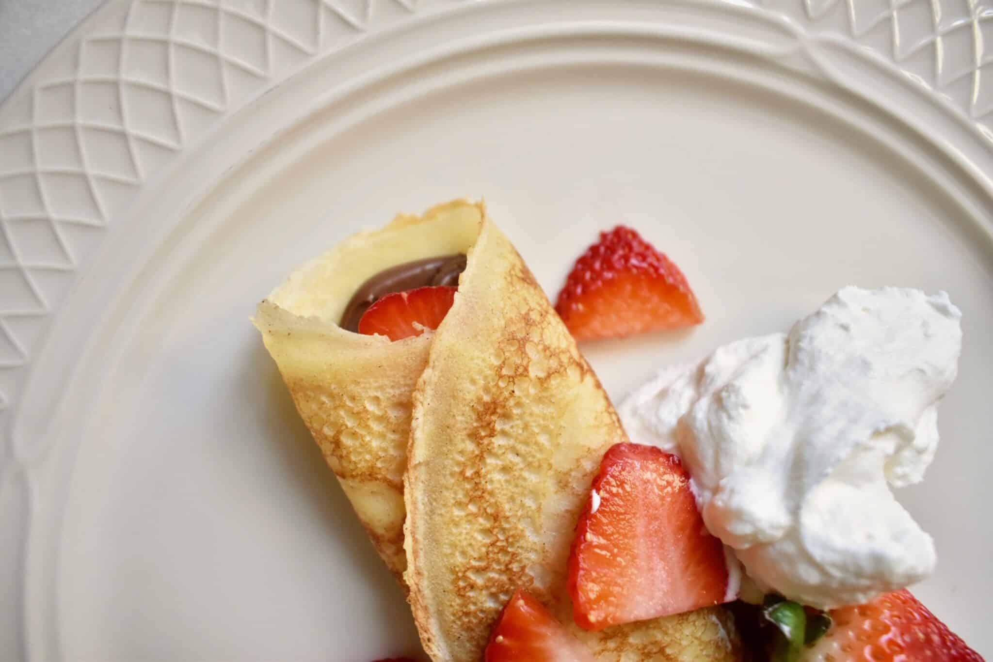 Have you tried making crepes at home before? Me either, until recently! And now I am here to tell you how achievable and delicious they are! Similar to pancakes, but much thinner, these light and airy crepes are filled and topped with fresh fruit, creamy Nutella, and homemade whipped cream. What makes this recipe so beautiful and versatile, though, is that you can top or fill the crepes with whatever filling you like! Transform this one recipe into a rich dessert crepe, a fruity breakfast crepe, or a savory lunch crepe.