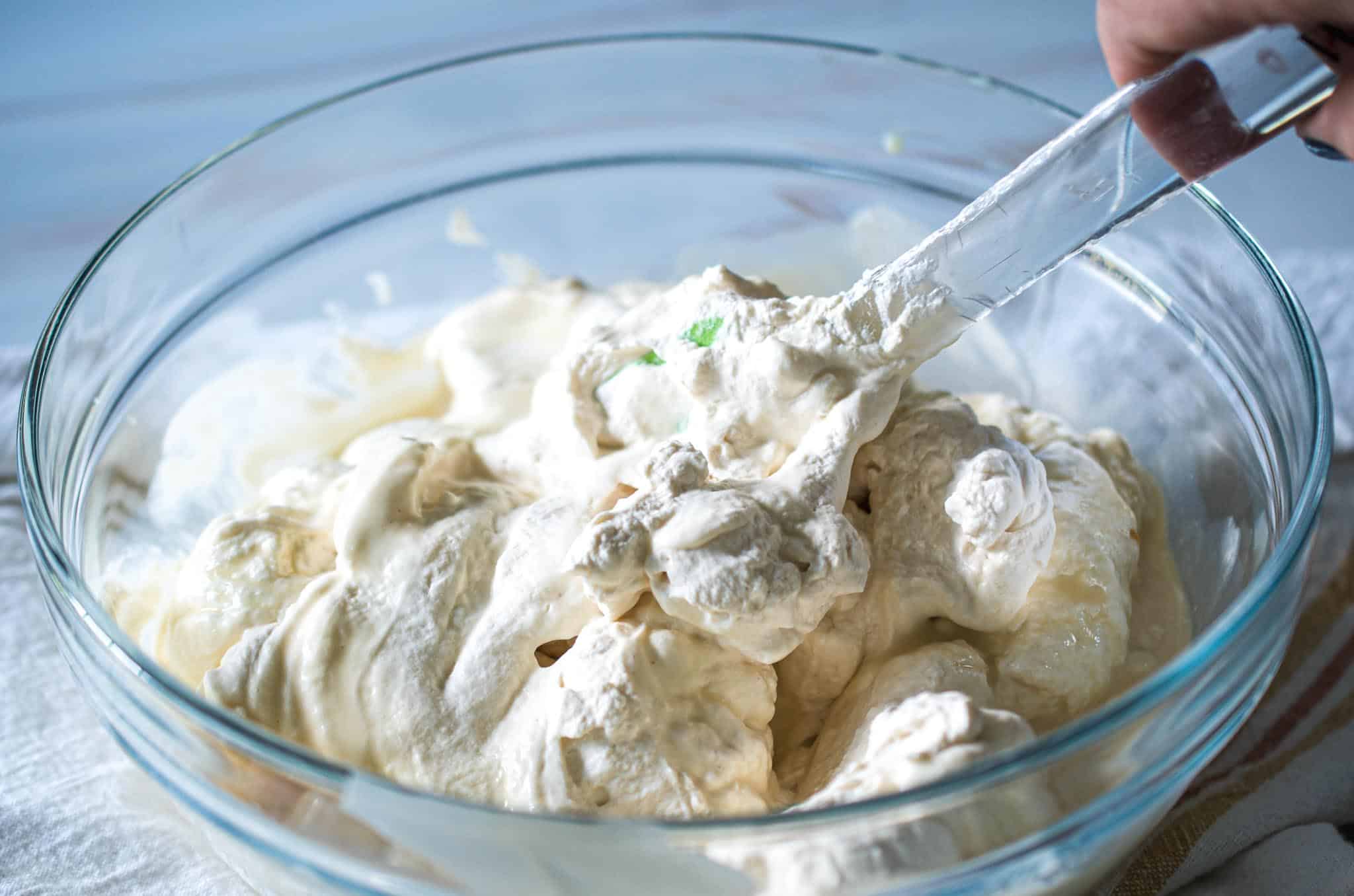 - In a large mixing bowl, whisk together the sweetened condensed milk, vanilla extract and pinch of fine salt. Add the whipped cream and gently fold the two together until thoroughly combined.