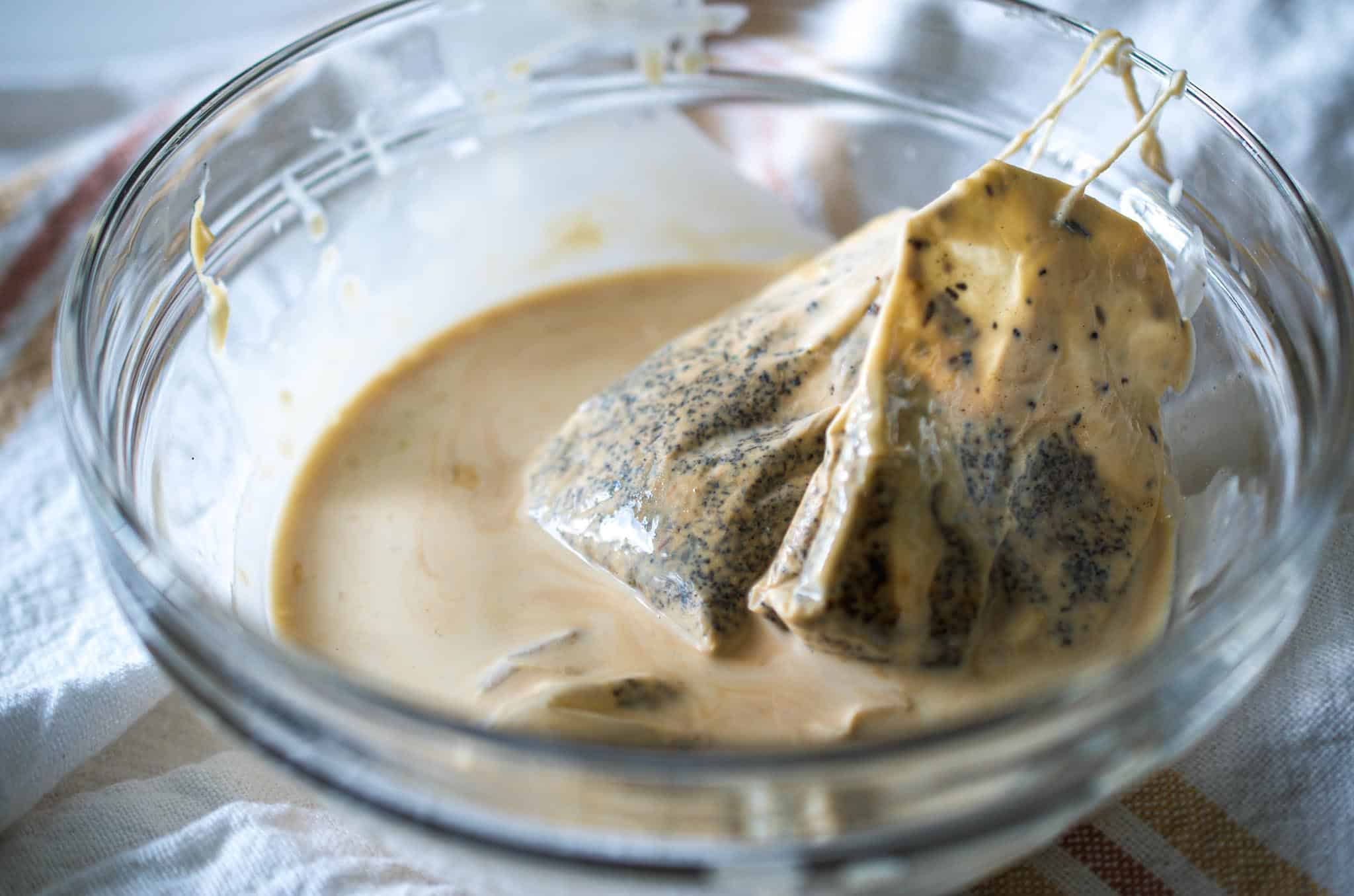 - In a small saucepan (or in the microwave), heat 1/2 cup of the heavy cream until it begins to bubble around the edges of the pan. Pour it over the tea bags and set it aside to steep for about 30 minutes. Drain and discard the tea bags, then place the heavy cream in the refrigerator.