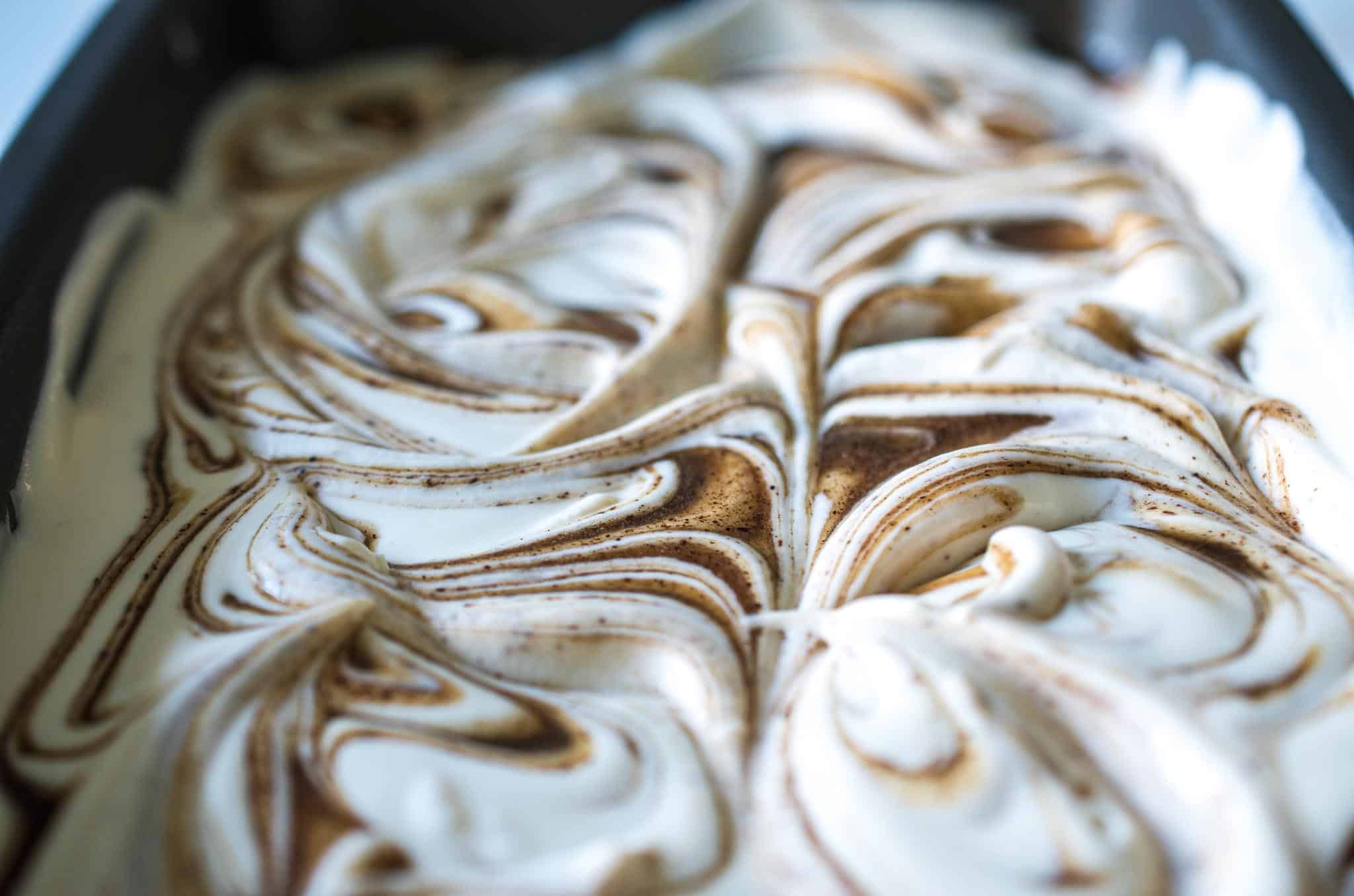 - Swirl in the syrup – transfer half the ice cream base to the loaf pan then drizzle half the maple cinnamon syrup over it. Use the tip of a blunt knife to swirl them together. Repeat the process with the remaining ingredients.